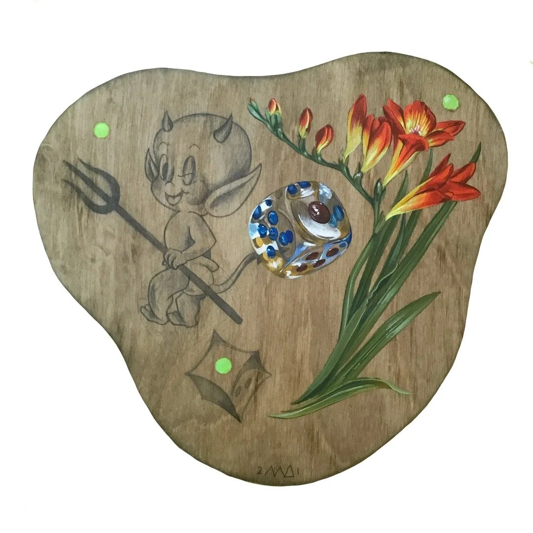 Laugh Now / Cry Later - 2021 - Gouache, graphite, Acrylate and glitter on wood panel - Available through Tiger Bunny Studio, San Francisco.